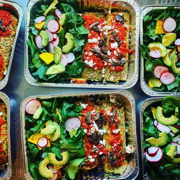 The menu changes each week and offers a seasonally influenced rotation of whole food meals that cater to all dietary lifestyles and restrictions with an emphasis on vegan dishes.